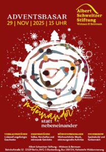 Wenn sich am 29. November 2025 ab 15.00 Uhr das Stiftungsgelände in Berlin-Blankenburg in festlichem Glanz präsentiert, dann ist es wieder soweit: Die Albert Schweitzer Stiftung – Wohnen & Betreuen lädt herzlich zum Adventsbasar ein. Unter dem Motto „Miteinander statt nebeneinander“ steht die Veranstaltung ganz im Zeichen der Begegnung und würdigt noch einmal den Stiftungsnamensgeber und seinen 150. Geburtstag in diesem Jahr.